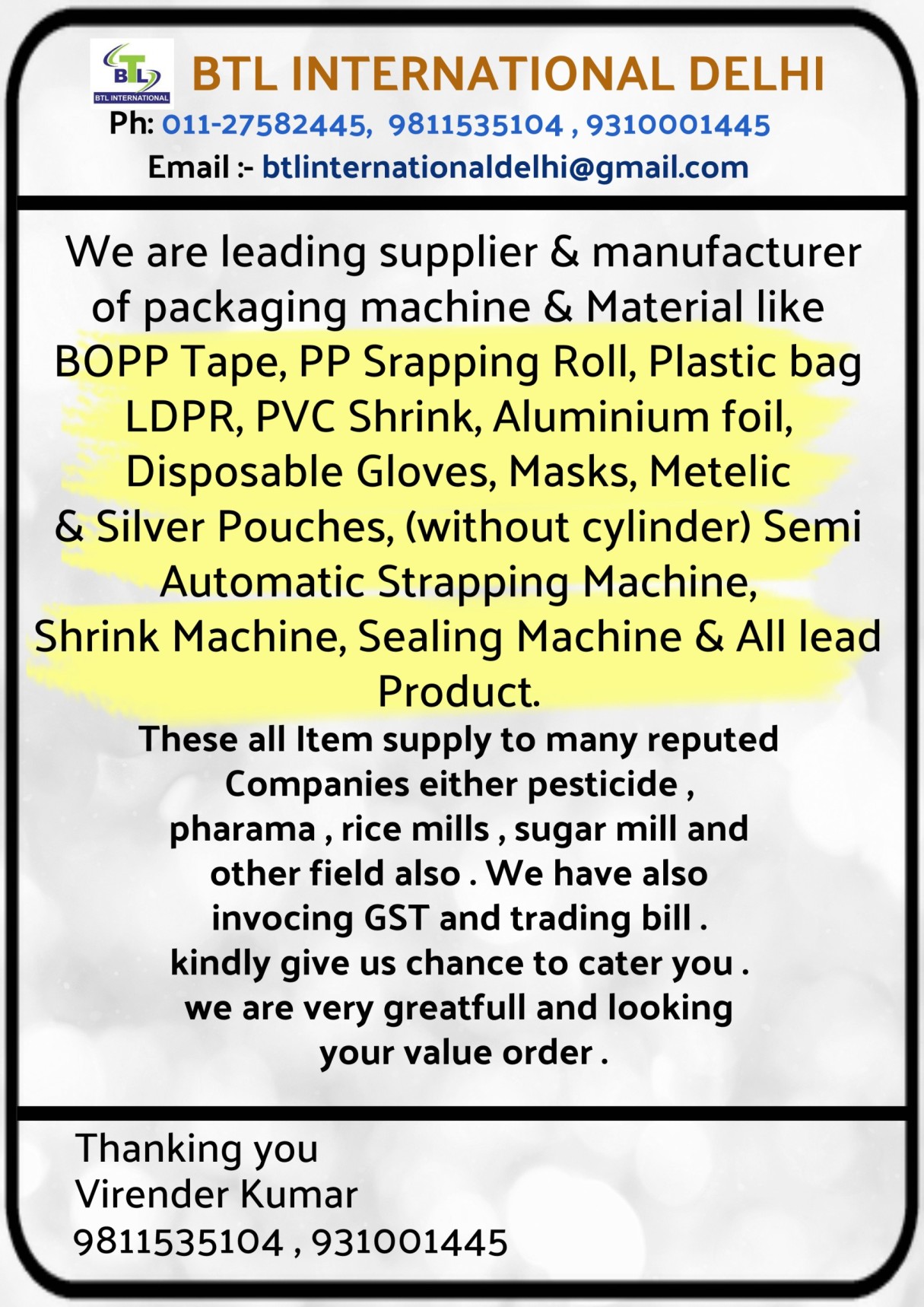 Established in year 2005, BTL International is a prominent Manufacturer and Supplier of Packaging Machines, Metallic Pouches, Sealing Machines, Packaging Materials and Multicolour Pouches. These products are manufactured under the leadership of proficient experts using the top quality raw material and advanced technology. Our organization has hired experienced work force, they can work with advanced machines and tools. Moreover, our organization has also hired quality controllers who check the quality of products on numerous parameters. These products are renowned in the market their lightweight, durability, sturdy construction, fine finish and low rate. Due to these facilities, we are capable to reach at the height of success and satisfy our clients urgent and massive requirement in predetermined period.
